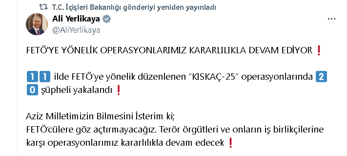 Bakan Yerlikaya, sosyal medya hesabından yaptığı açıklamada, Emniyet Genel Müdürlüğü Terörle Mücadele Daire Başkanlığı, İstihbarat Başkanlığı ile Kaçakçılık ve Organize Suçlarla Mücadele Başkanlığı koordinesinde 11 ilde FETÖ’ye yönelik ‘Kıskaç-25’ operasyonları düzenlendiğini belirtti. Buna göre; Adana, Ankara, Antalya, Çorum, Elazığ, İstanbul, İzmir, Ordu, Samsun, Kahramanmaraş ve Van’da düzenlenen eş zamanlı baskınlarda, örgütün sözde askeri mahrem yapılanmasında yer alan, ByLock kullanıcısı ve hakkında kesinleşmiş hapis cezası ile yakalama kararı bulunan 20 şüpheli yakalandı.