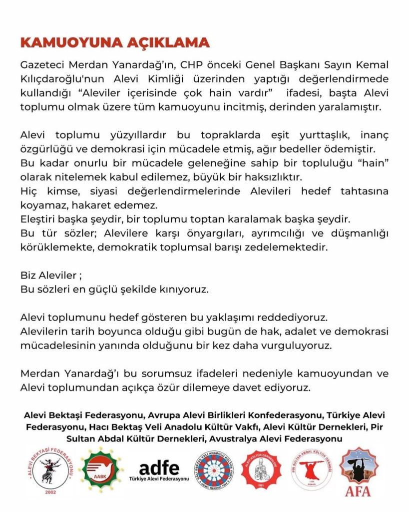 Gazeteci Merdan Yanardağ’ın, CHP önceki Genel Başkanı Sayın Kemal Kılıçdaroğlu’nun Alevi Kimliği üzerinden yaptığı değerlendirmede kullandığı “Aleviler içerisinde çok hain vardır” ifadesi, basta Alevi toplumu olmak üzere tüm kamuoyunu incitmiş, derinden yaralamıştır.