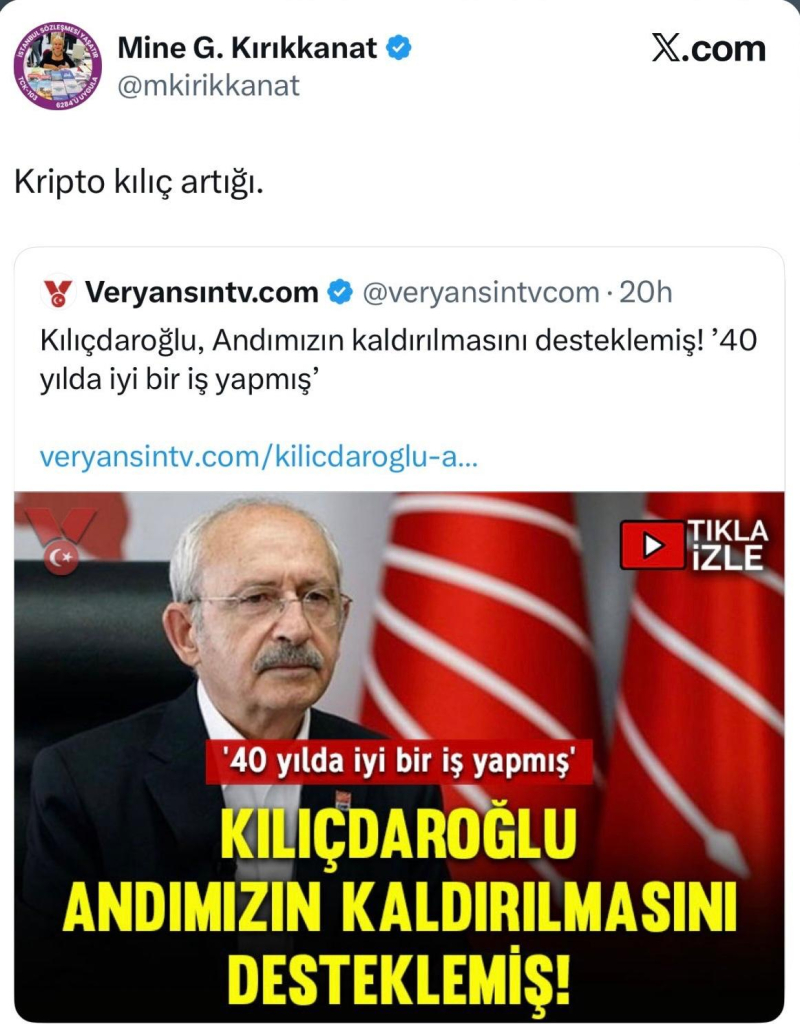 Mine Kırıkkanat’ın, eski CHP Genel Başkanı Kemal Kılıçdaroğlu için sarf ettiği “kripto kılıç artığı” ifadesi, bir dil sürçmesi değildir. Bu, tarih bilinci olan bir coğrafyada, kelimelerin ağırlığını bilen bir kalemden çıkmışsa, masum görülemez.